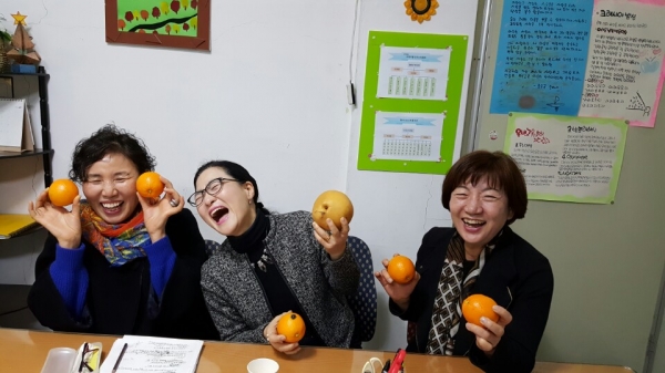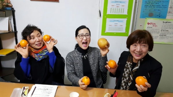 세 분의 오렌지를 닮은 행복한 밝은 웃음.