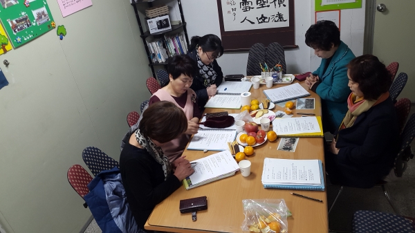 장옥련선생님 먼저 하시고, 그 다음에 김정애샘, 강명화샘, 정윤순(나), 장은경샘, 노정희팀장님 순으로
