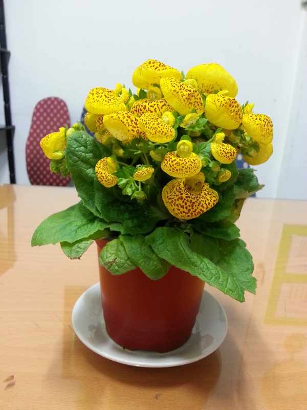 오선생님께서 사 오신 노란 주머니꽃(칼세오라리아)이 환합니다